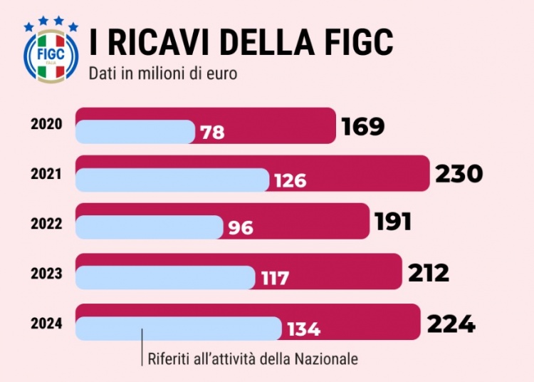 预算方面,回顾过去十年财务数据,即便两次无缘世界杯正赛,足协依旧实现盈利,只是营收会出现下滑(2018年营收8100万欧元,2017年为8800万欧元;2022年营收9600万欧元,2021年则有1.26亿欧元)。即便今年落到最差结局,大概率也会延续这一盈利态势。但这份预算,能清晰算出世界杯对意大利足协的实际价值。足协管理层解释,与赞助商签订的合作协议中设有扣款条款:一旦无缘世界杯,赞助费用将自动下调,总计会减少950万欧元收入。需要说明的是,足协商业板块正处于高速增长阶段。以赞助合同常规的四年周期核算,国家队相关赞助与广告营收,从2015-2018周期年均4200万欧元,增至2019-2022周期年均4900万欧元。而2023开启、今年结束的四年周期营收大幅飙升,年均超7000万欧元,2024年更是创下8100万欧元的峰值。