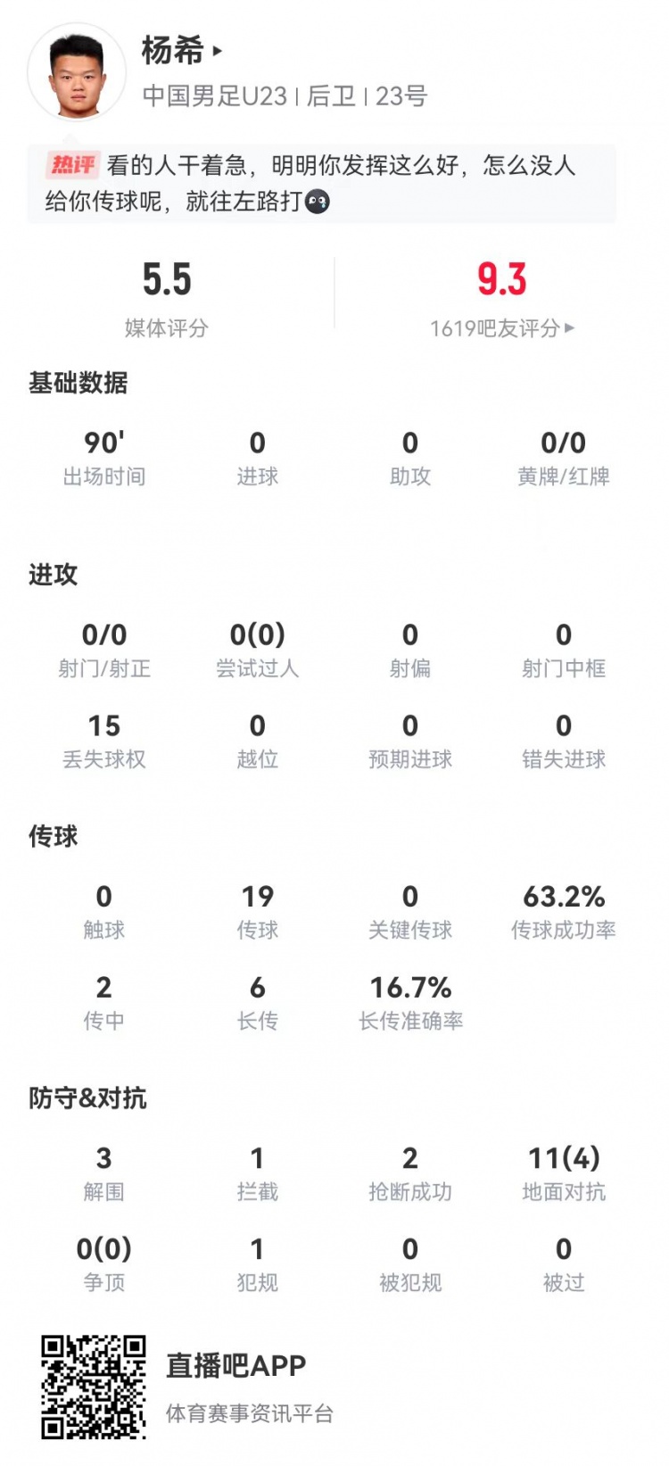 1月25日讯 U23国足在U23亚洲杯决赛0-4完败于日本,右翼卫杨希本场数据如下: